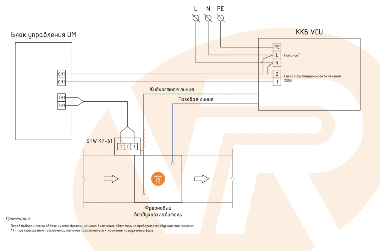 Один контур. Компоненты: реле высокого давления с автоматическим возвратом в рабочее состояние; реле низкого давления; датчик давления конденсации; сервисные клапаны Шредера; запорные вентили на выходе из компрессорно-конденсаторного блока.