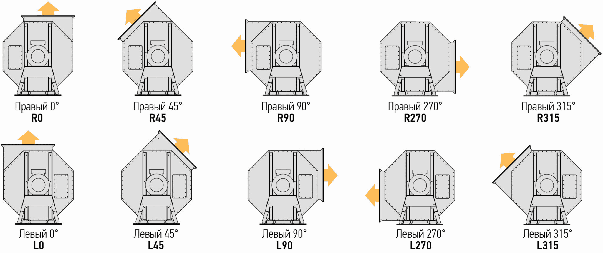 R – направление вращения рабочего колеса (L – левое, R – правое)
